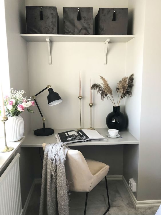 Choose mild tone colours which help you concentrate and improve your mood. Give emphasis with colour at the objects or smaller pieces of furniture that you will be using. If your desk leans on a wall, use a mirror, a small array of pictures, a wallpaper or photos of your beloved ones, to make the place cosier.