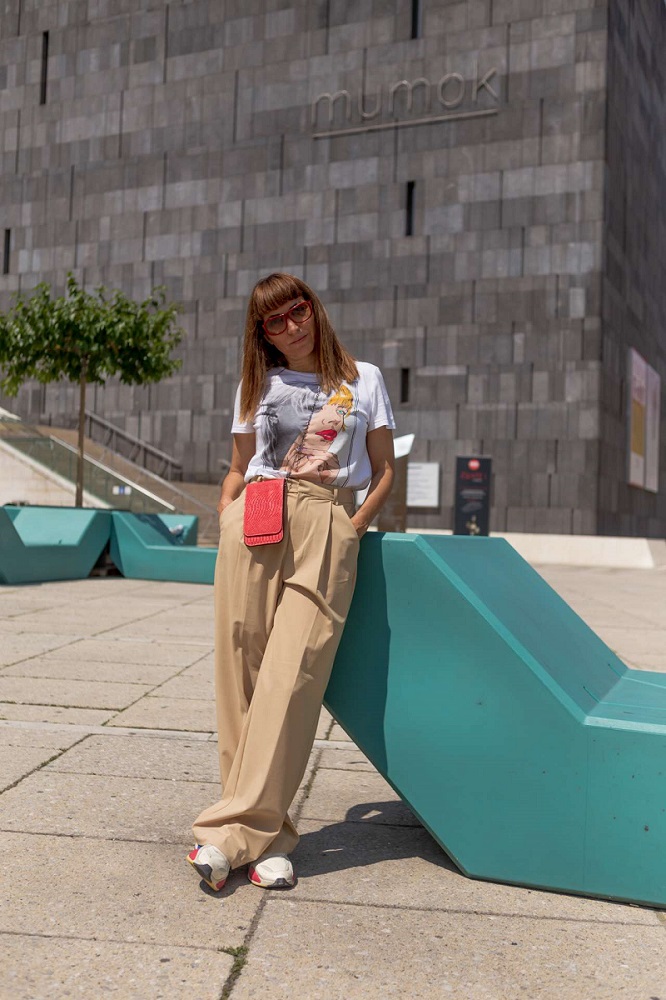 Matched with a beige pair of trousers, a black and golden striped blouse, and sneakers.