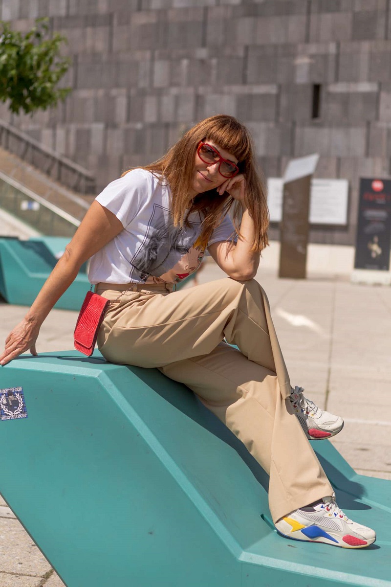 Συνδυασμένο με μπεζ παντελόνι ριγέ μπλούζα με μαύρη – χρυσή ρίγα και αθλητικά παπούτσια.